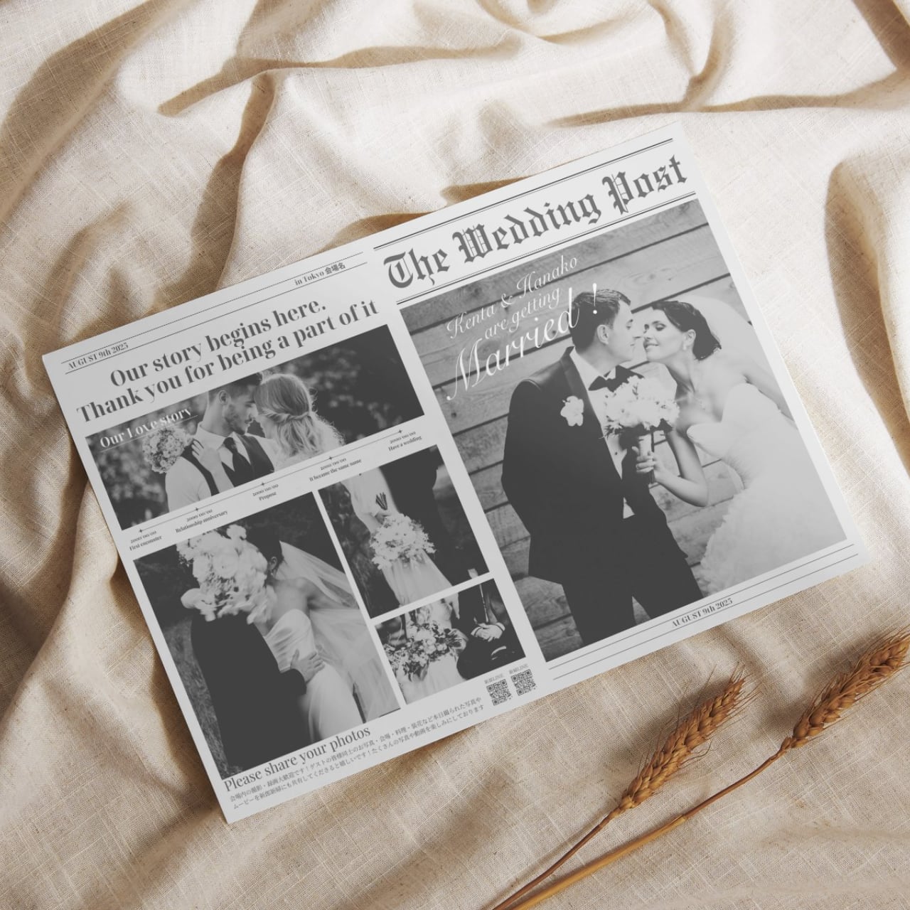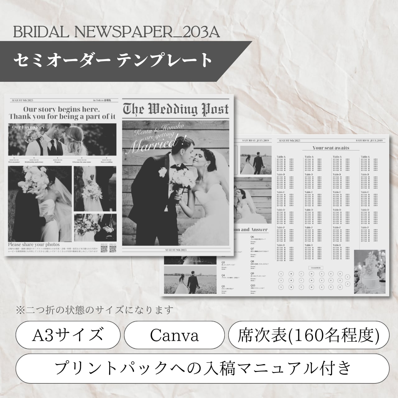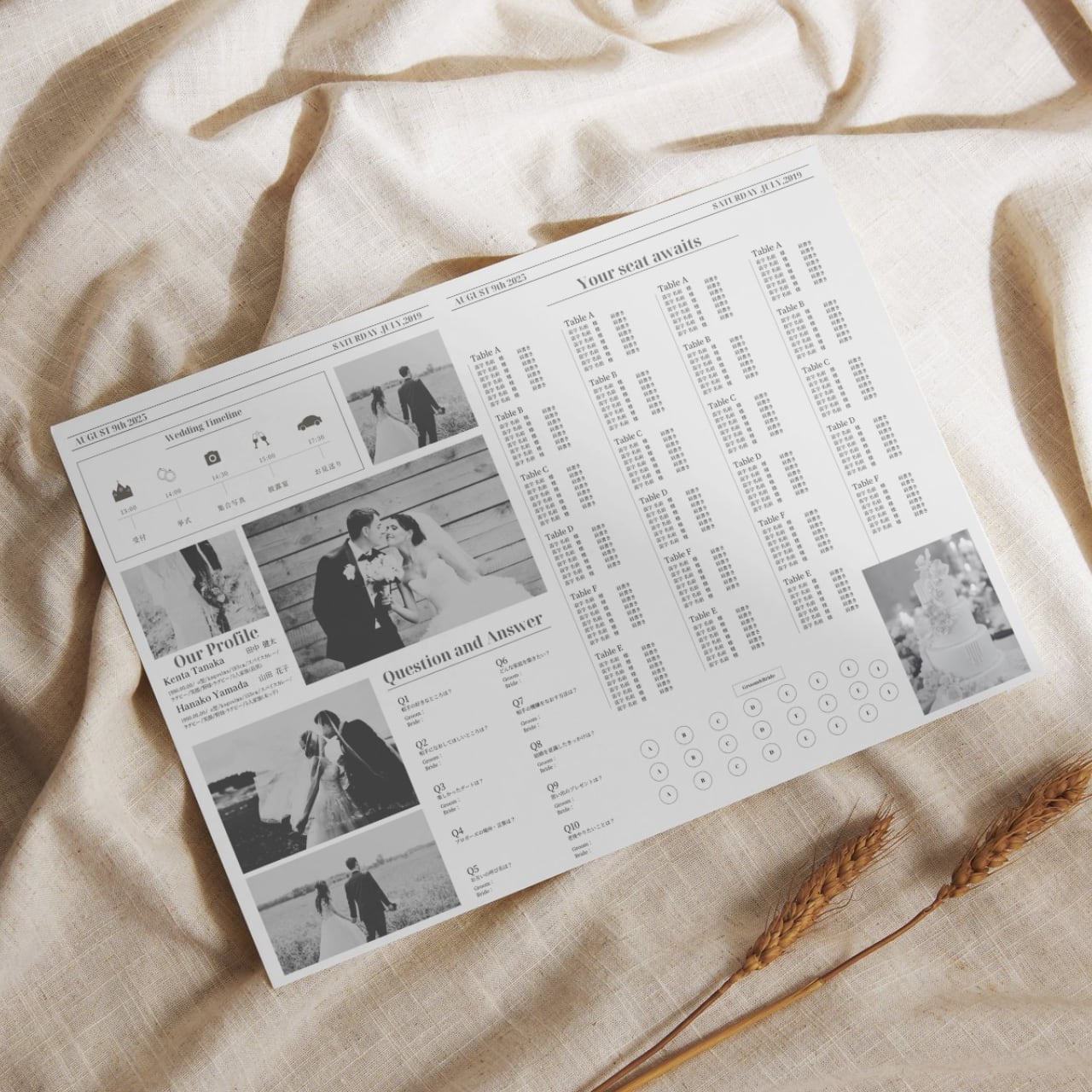 【No.203a】セミオーダー_ブライダル新聞 テンプレート|Canva編集OK・席次表付き・両面デザイン