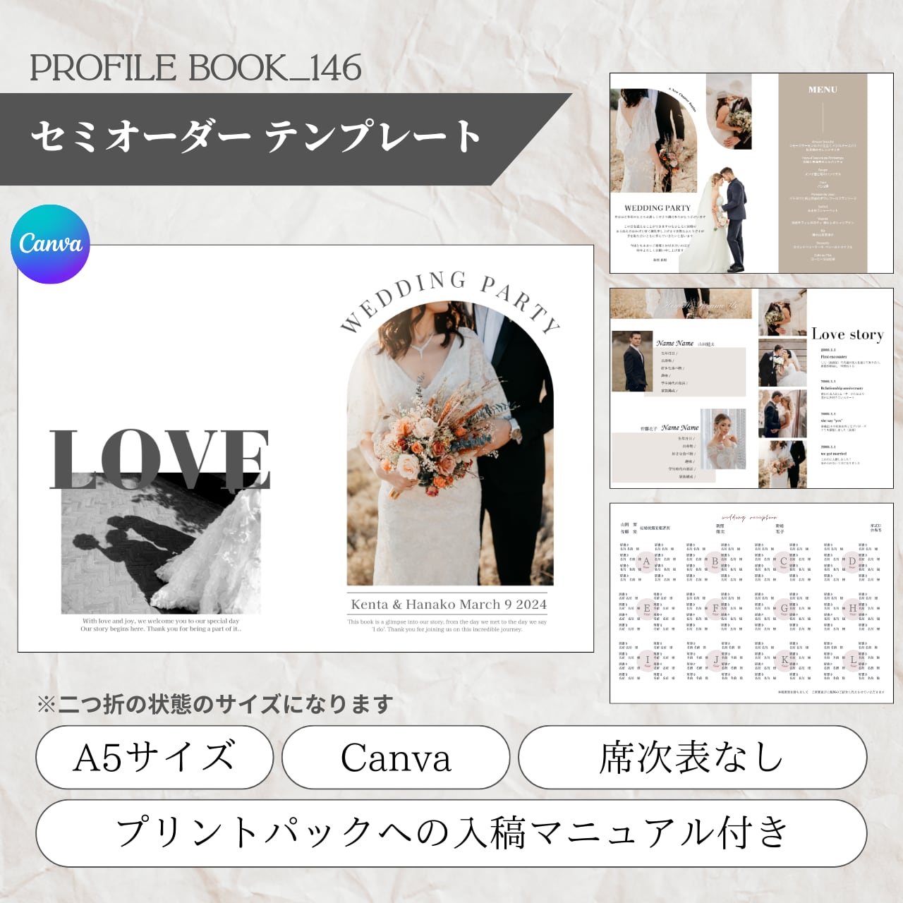 【No.146】セミオーダー_プロフィールブック テンプレート|Canva編集OK・A5サイズ|席次表付き・印刷ガイド付・スマホ対応